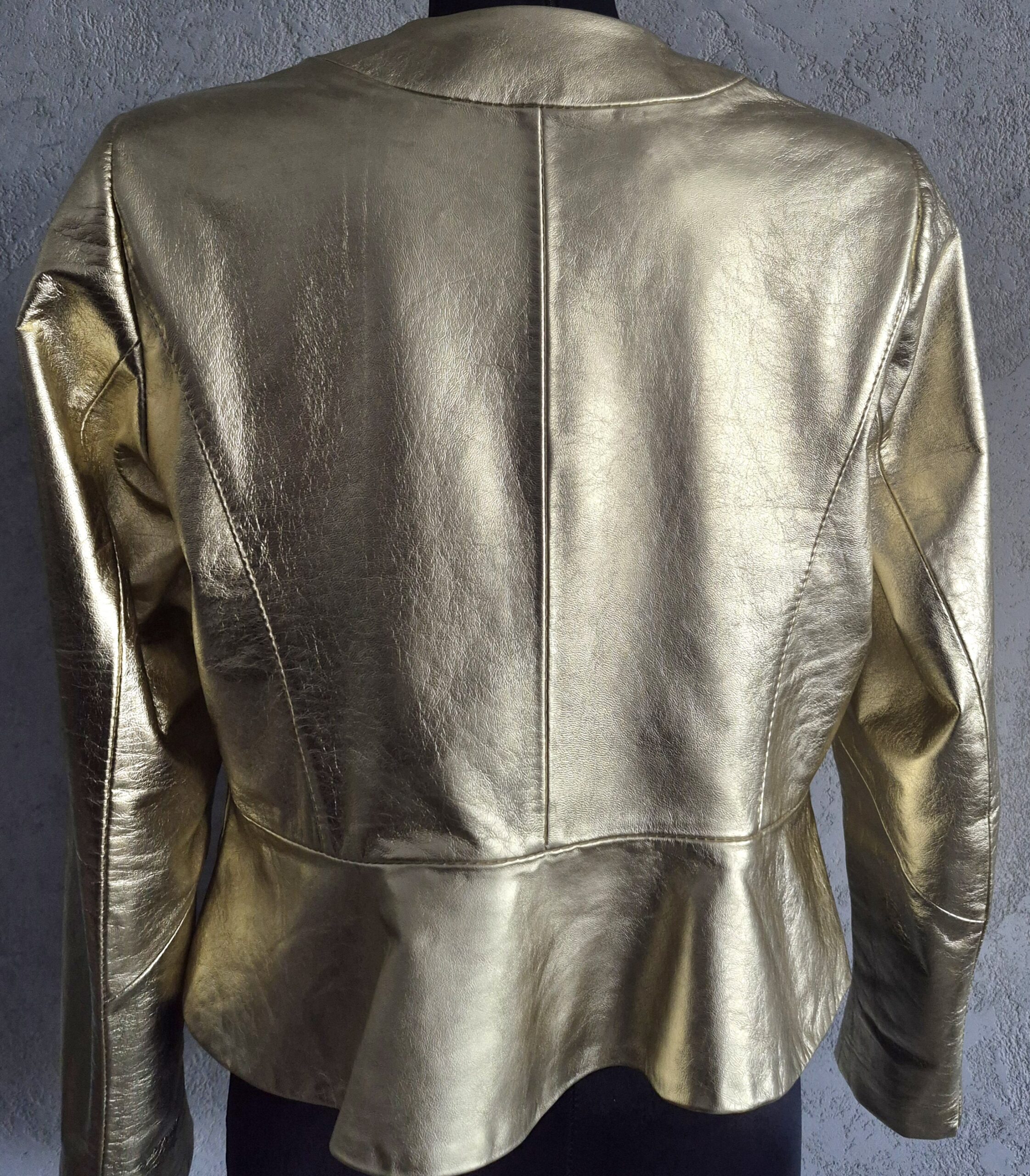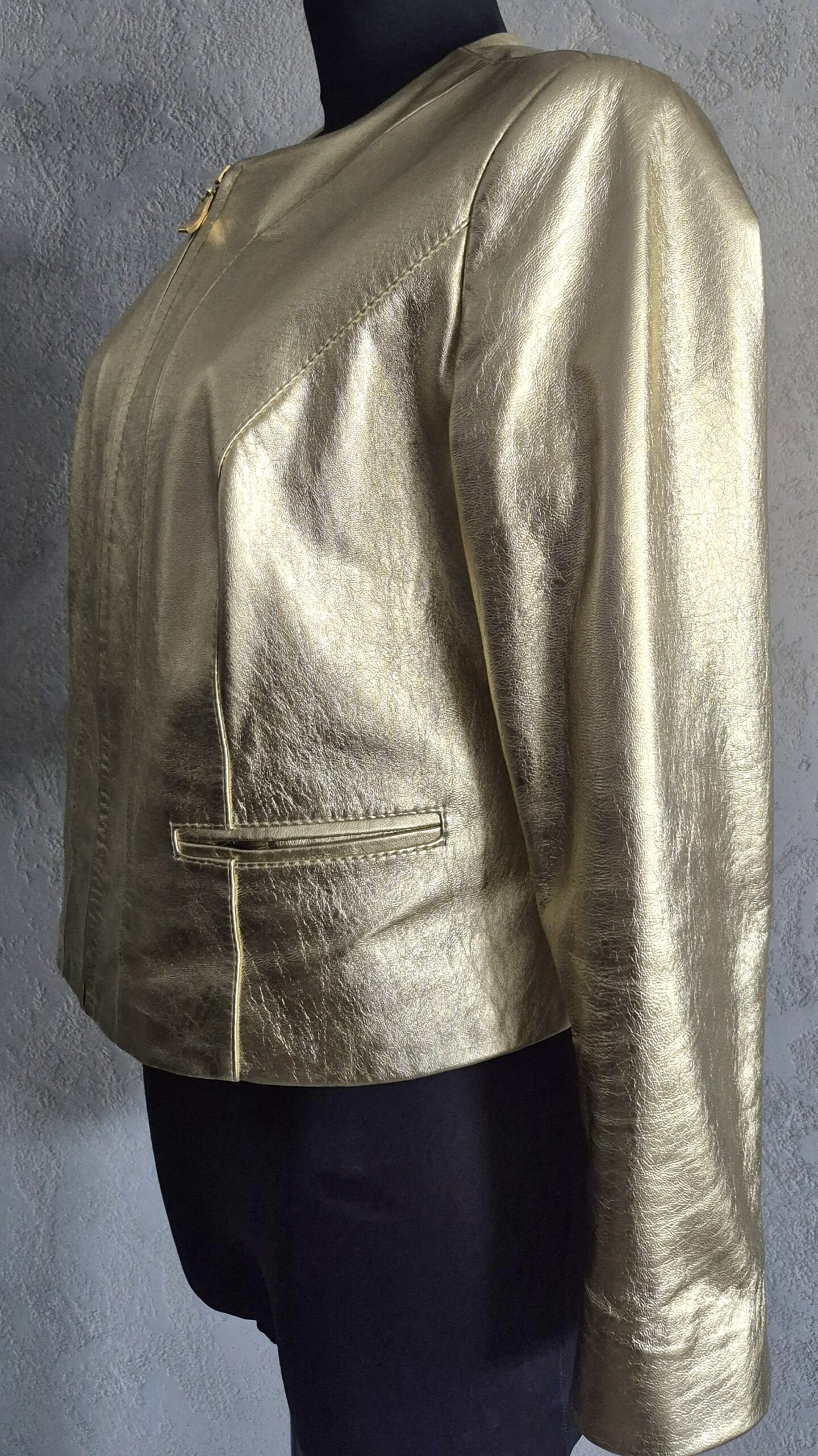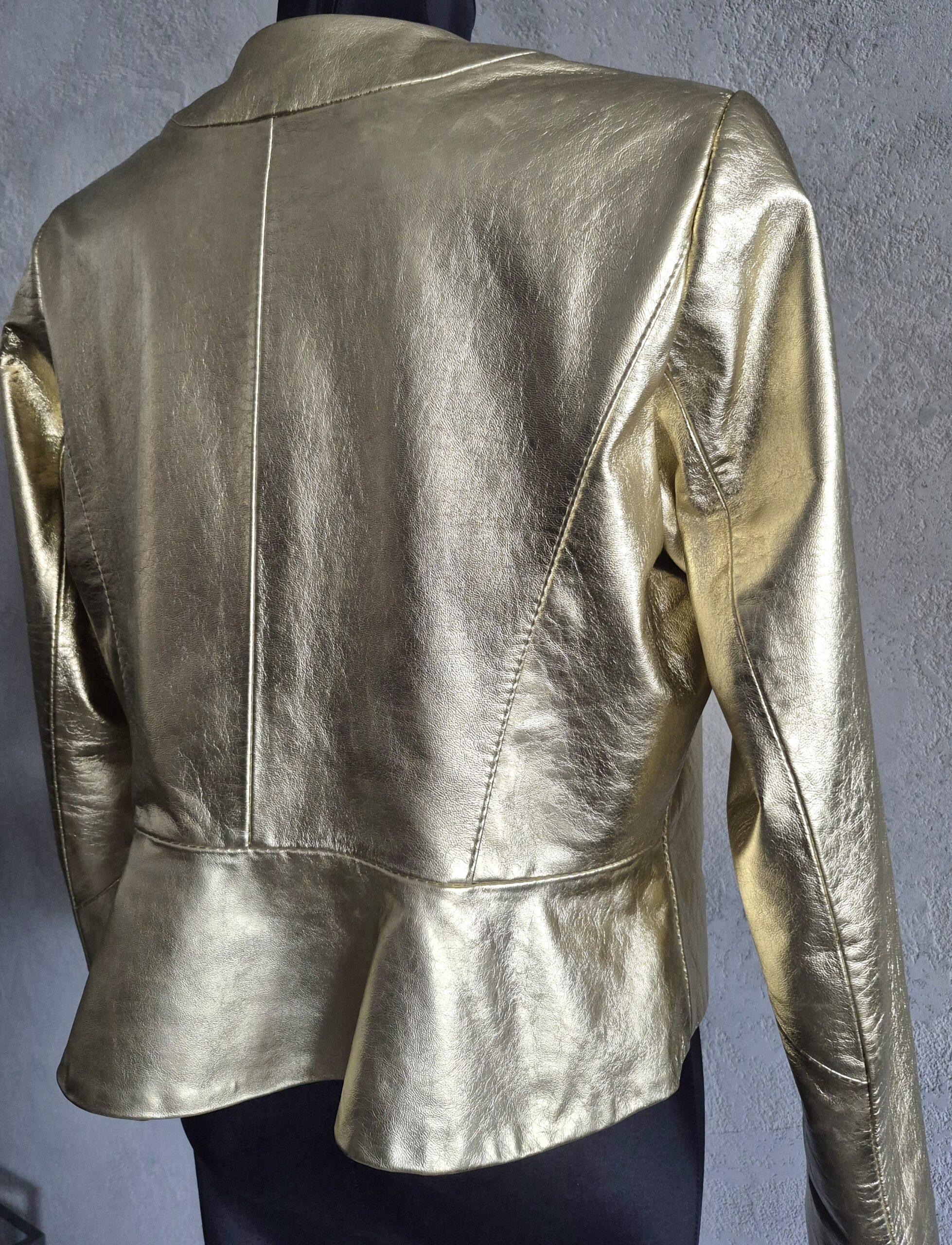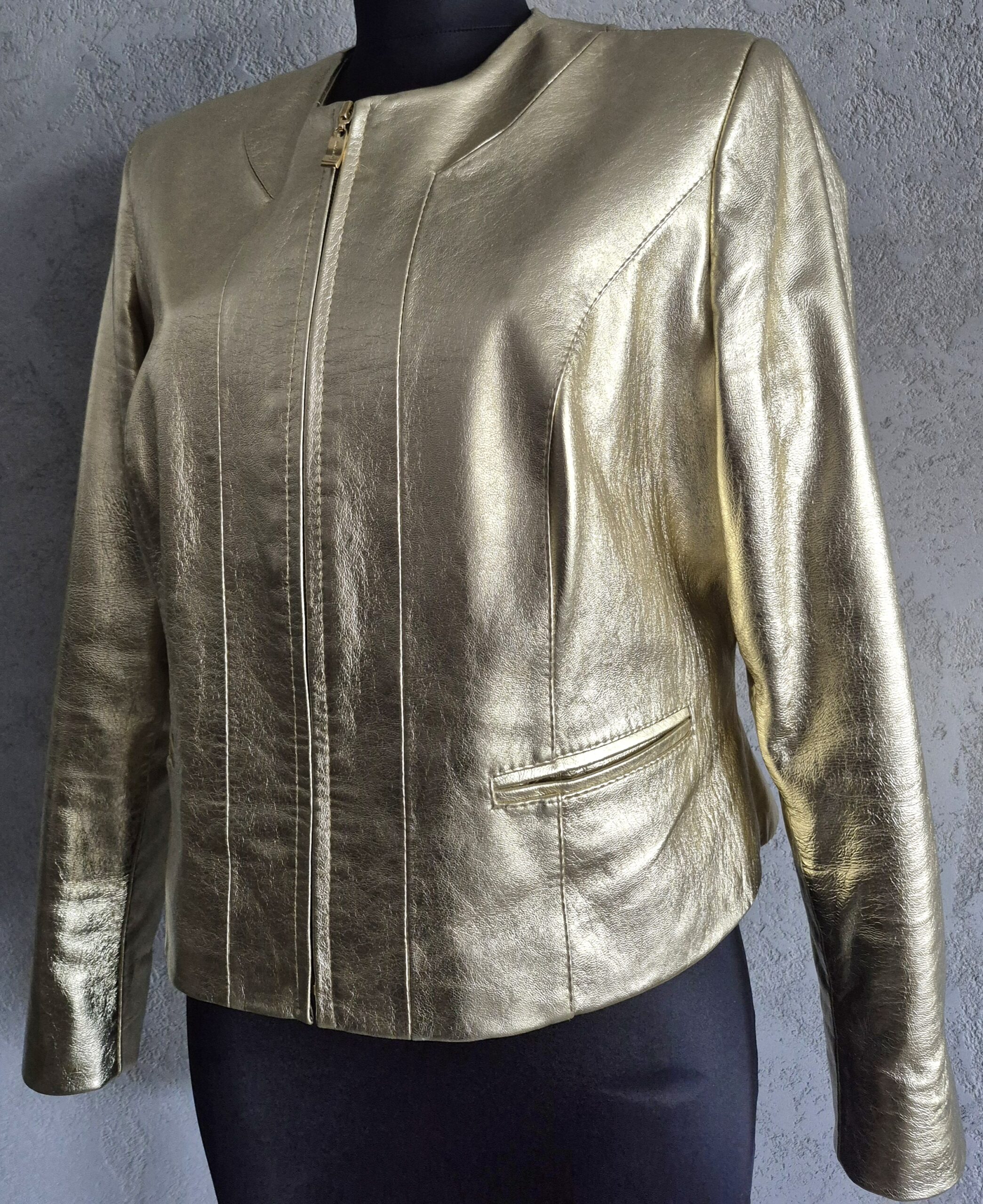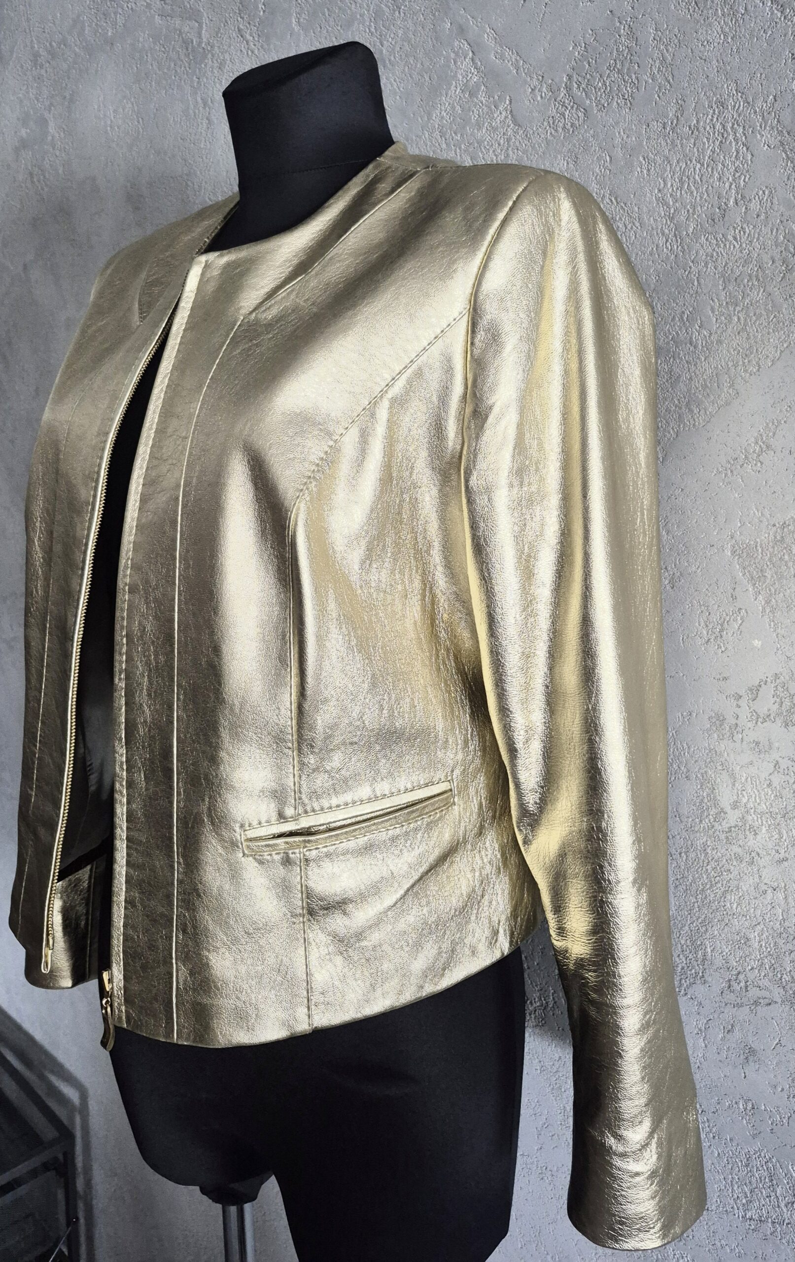 Skórzany żakiet z baskinką to bardzo efektywna kurtka skórzana. Ten model charakteryzuje się okrągłym dekoltem i długim rękawem. Uroku dodaje złoty suwak. Idealnie dopasowuje się do sylwetki podkreślając jej walory. Idealnie sprawdzi się na imprezy okolicznościowe i nie tylko. Złoty kolor dodaje elegancji i gracji.